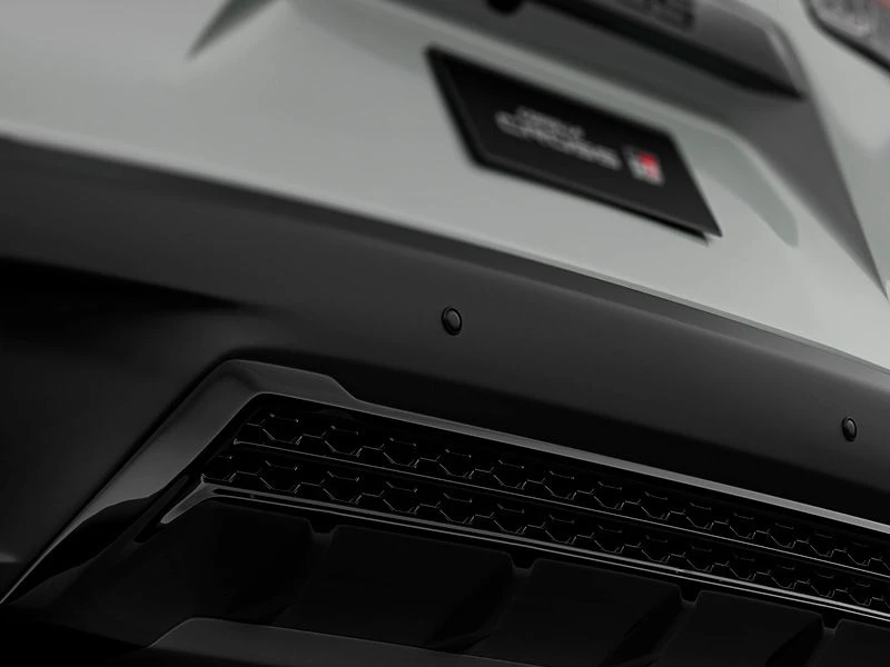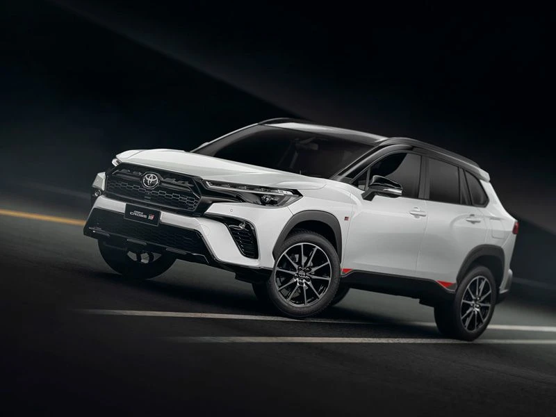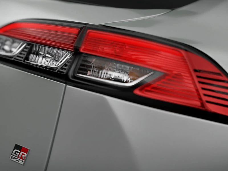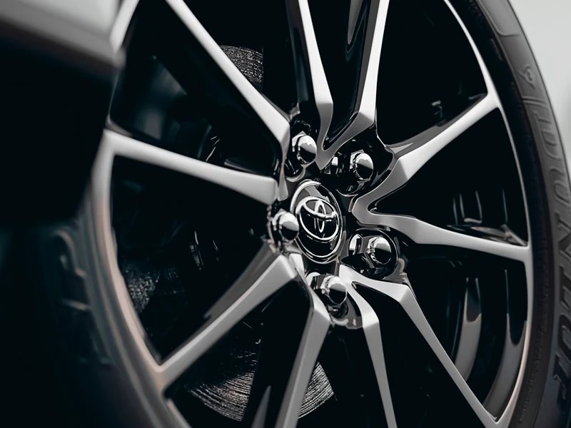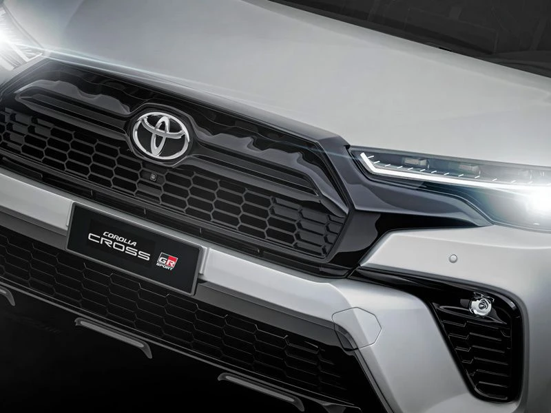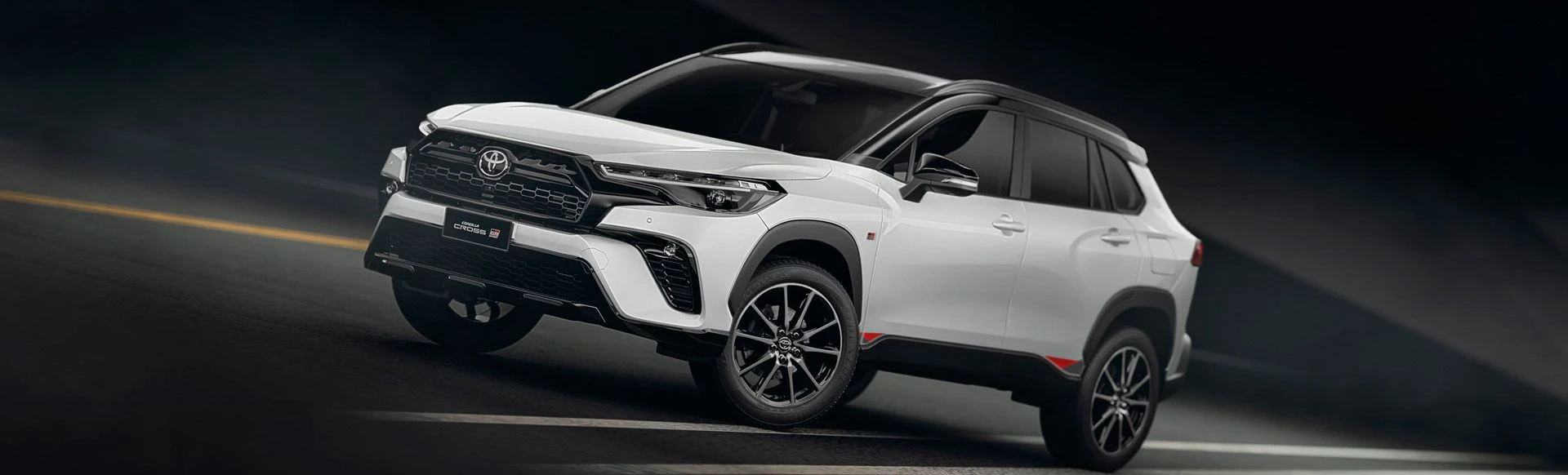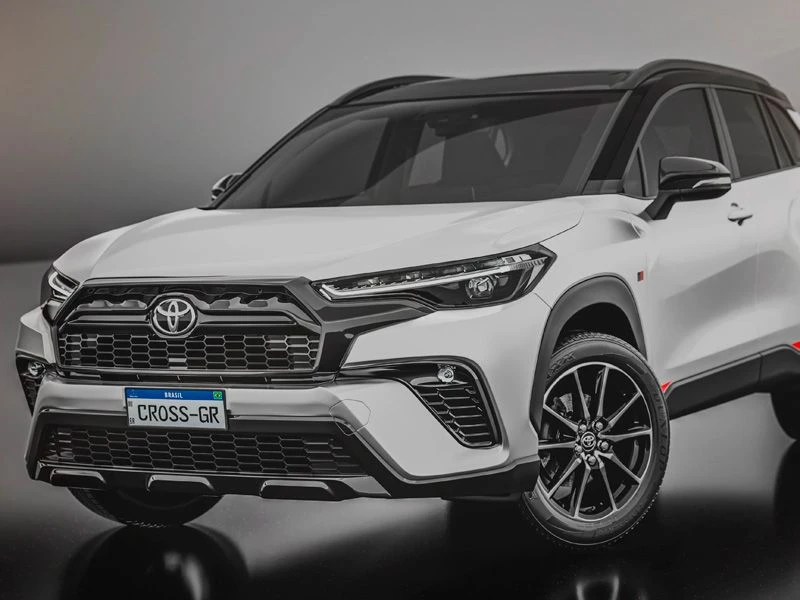 Teto solar elétrico com função antiesmagamento, rodas de liga leve 18" e saias esportivas laterais TOYOTA GAZOO Racing. Acabamento interno em couro, material sintético e ultrasuede na cor preta com costuras em vermelho.